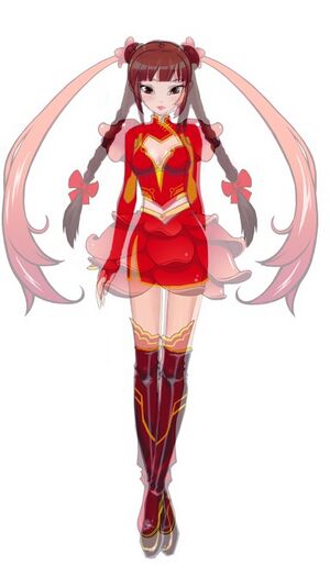外貌:红发、紅瞳,丹凤眼,芙蓉头花,反重力双马尾,巨乳,玫瑰花瓣裙,波浪形边缘过膝靴