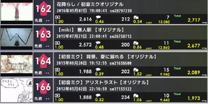 4、n-buna的大量歌曲均被刷了200评论,仅有《四瓣》《海百合海底谭》《黎明与萤火》《Meru》未被刷评论,导致其全曲25首均符合收录条件至少进入副榜(见右上),其初投稿《Alice Trust》及第三作《空之歌》在投稿6年后首次出现在周刊。n-buna因此刷新纪录,成为在单期周刊内入榜(包括副榜)歌曲最多的P主。