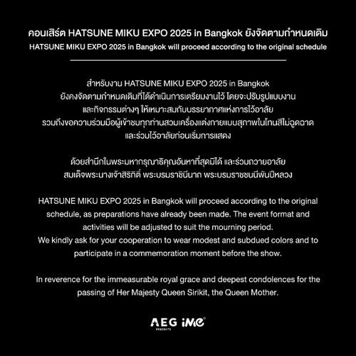 2025年10月24日,泰国詩麗吉·吉滴耶功王太后病逝,享年93岁。主辦方AEG Presents Asia考慮到有關因素,仍決定按原定日程舉行泰國曼谷場演出,遵循當地政府規定,要求廣大觀眾在演出開始前保持穿着整潔樸素、衣服色彩不鮮艷,儀表端莊地參加泰國王太后詩麗吉·吉滴耶功的哀悼儀式。