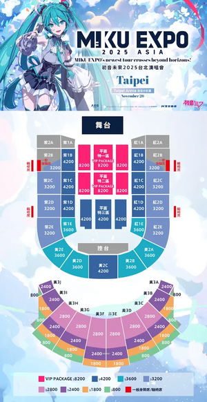VIP 前排企位:8200新台币 后排企位:4200新台币 下层 正面座位及内侧前排座位:4200新台币 下层 内侧后排座位:3600新台币 下层 外侧座位:3200新台币 上层 正面前排座位:2800新台币 上层 侧面前排座位、正面中间座位:2400新台币 上层 侧面中间座位、正面后排座位:1800新台币 上层 边角座位:800新台币 |